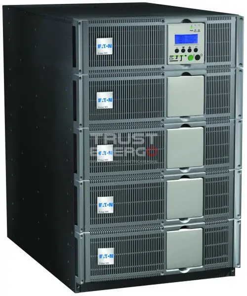 Eaton MX Frame 15 000 представляет собой прибор для преобразования трехфазного питания в однофазное, перевода потребителей в автономный режим при отключении внешнего питания и перегрузке, сглаживания сетевых помех и коррекции частоты питания в относительно широком диапазоне. Для подключения к внешней сети предусмотрены клеммы, потребители присоединяются через розетки на 10 и 16 А. Входное напряжение подается в двух диапазонах с номиналом 220 и 380 В.